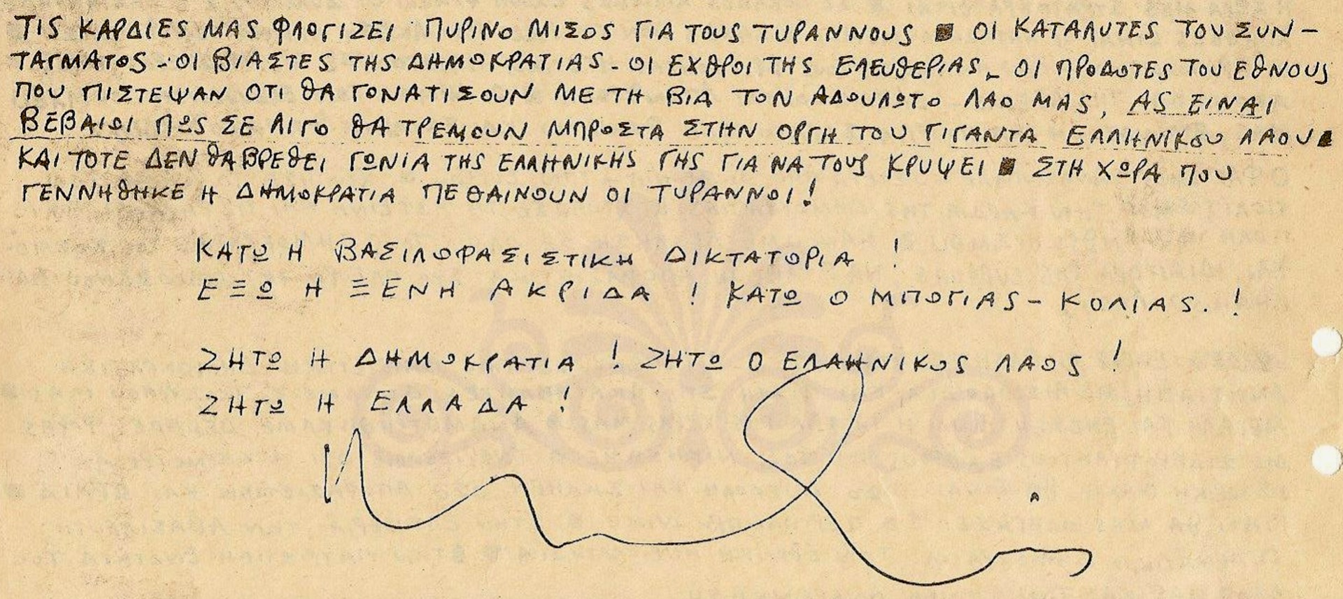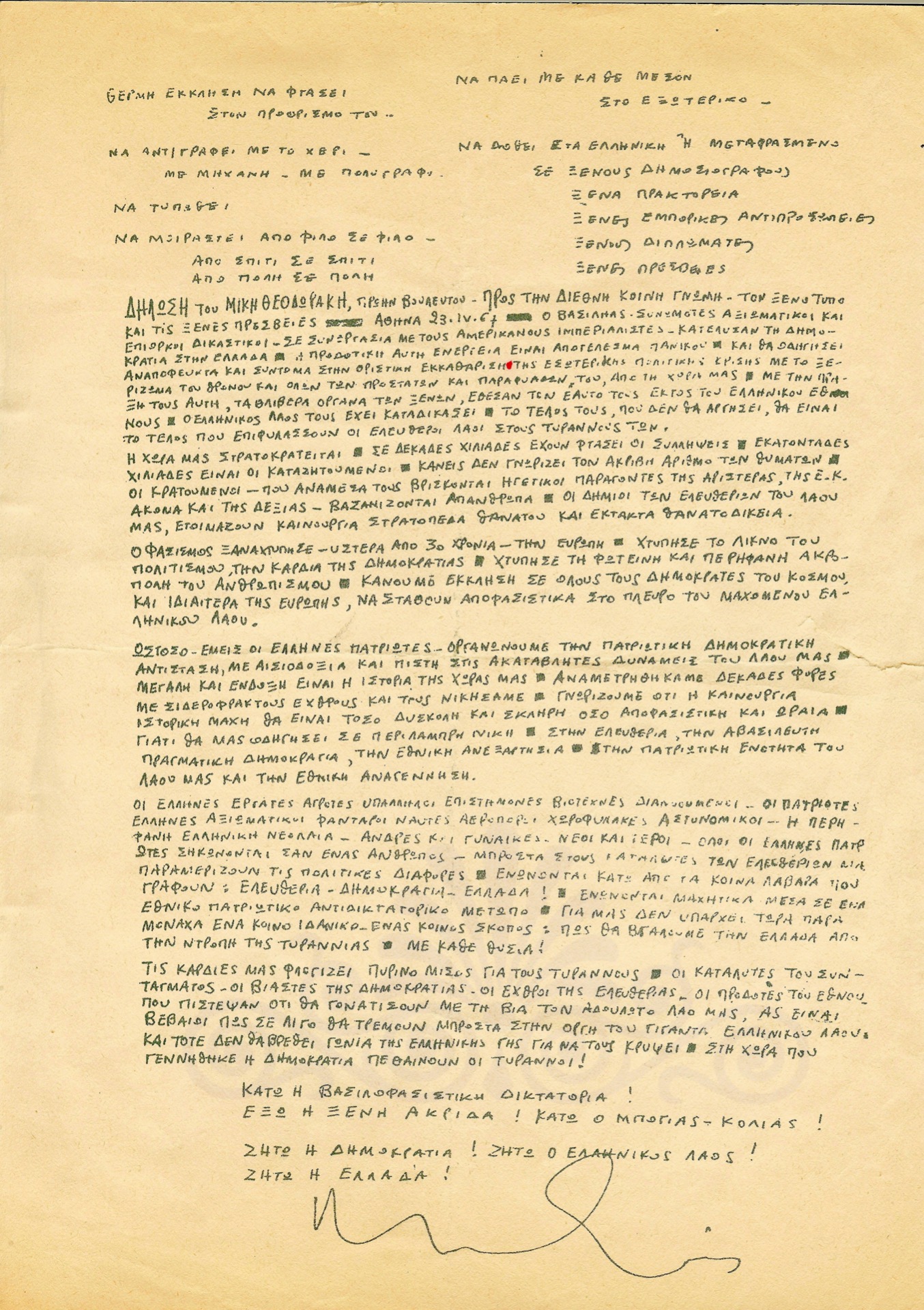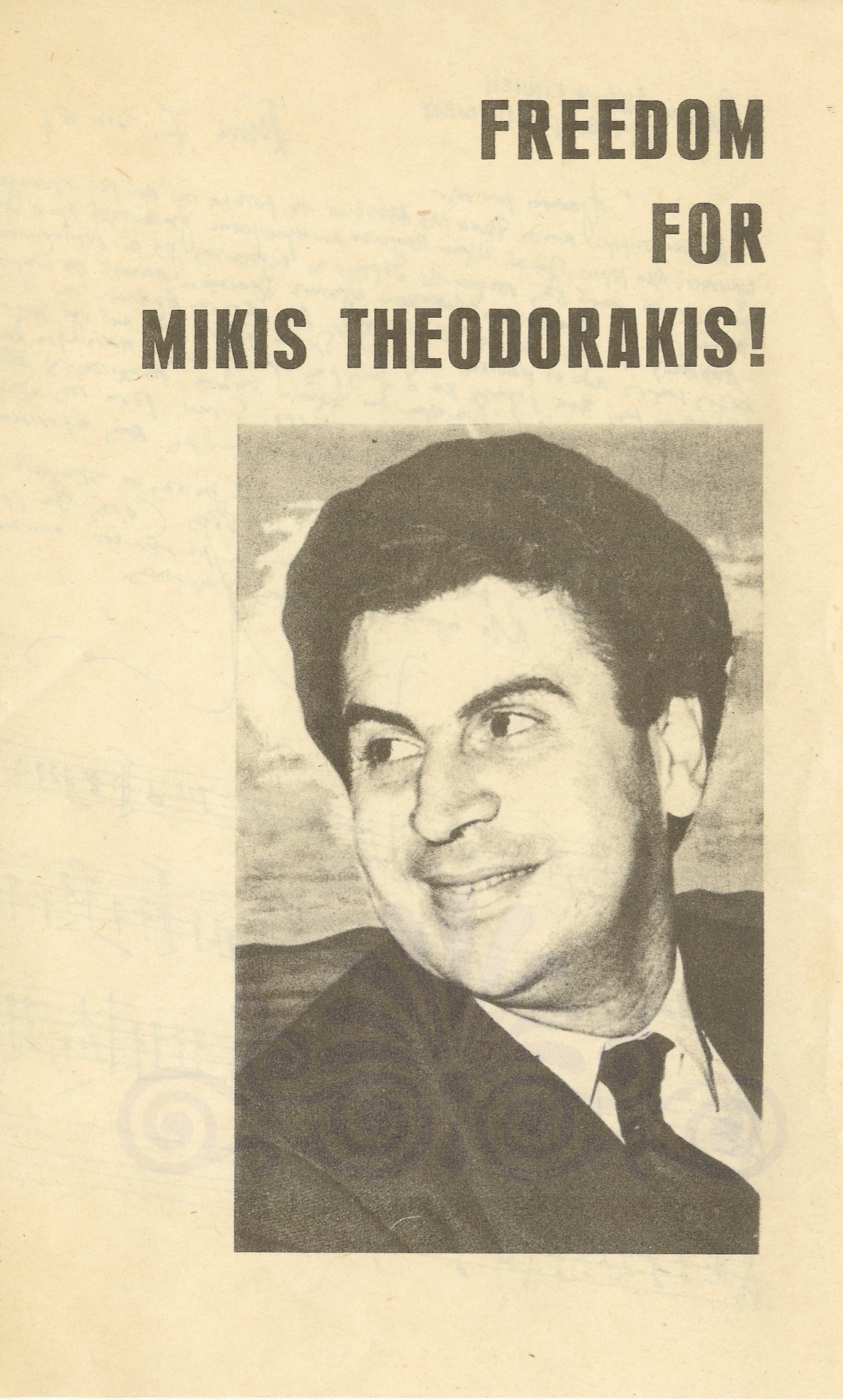 1970 Η χούντα ύστερα από διεθνείς πιέσεις επέτρεψε την έξοδο του Μίκη Θεοδωράκη από την Ελλάδα. Ο Μίκης με τη δράση του εναντίον της χούντας αναδείχτηκε ως παγκόσμιο σύμβολο του αγώνα κατά της δικτατορίας.
