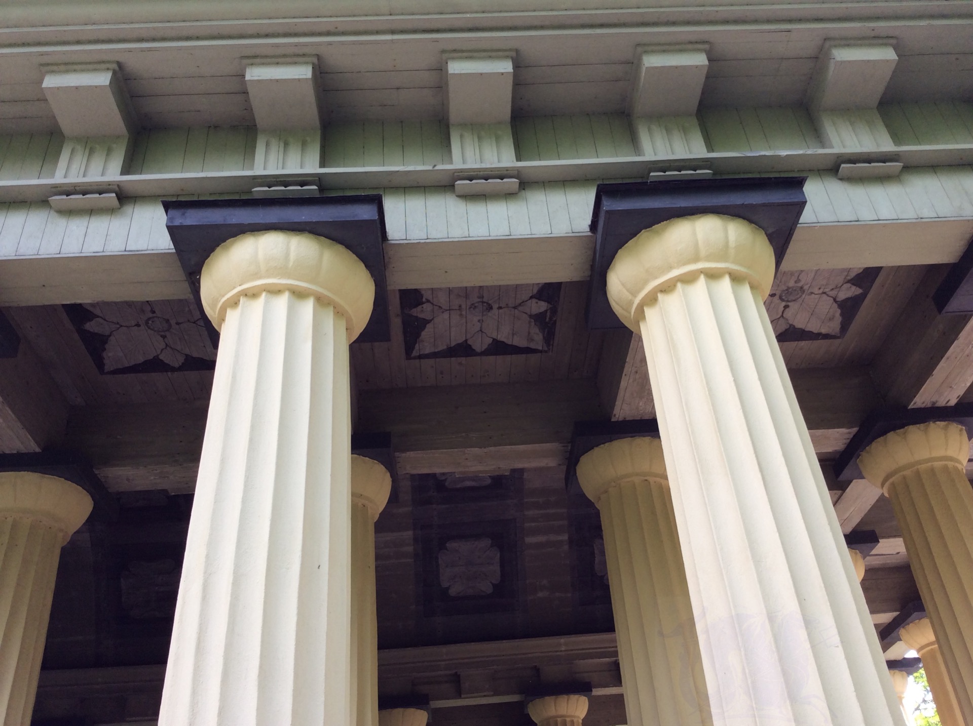 - Η ξύλινη σκεπή του προσομοιάζει τις στέγες αρχαίων ναών με τις σχετικές διακομίσεις και την ανάλογη μορφή.